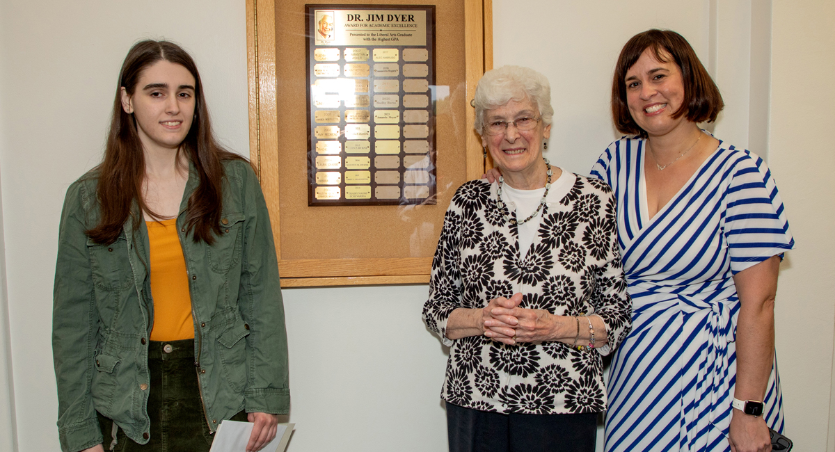 From left: Amanda Moyer, the 2023 recipient of the Dr. Jim Dyer Award for Academic Excellence; Madeline Dyer, wife of the late Dr. Jim Dyer; and Jennifer Campbell '97, first recipient of the Dyer Award.